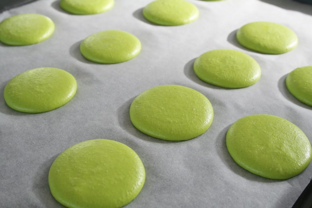 Préchauffer le four à 140°C. Placer uen grille au milieu du four. Quand celui-ci est chaud, placer une plaque de macarons sur la grille et laisser cuire 16 minutes selon la puissance du four.