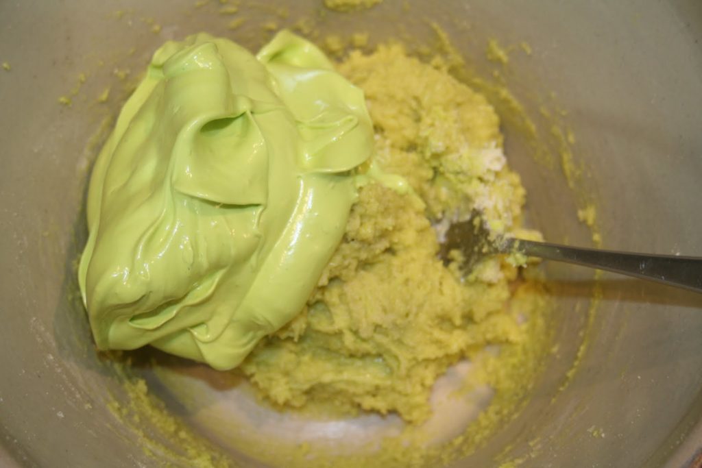Quand toute la meringue a été ajoutée, continuer à travailler la pâte avec une spatule en l’écrasant un peu. On est en train de « macaroner » la pâte pour lui donner trois adjectifs: