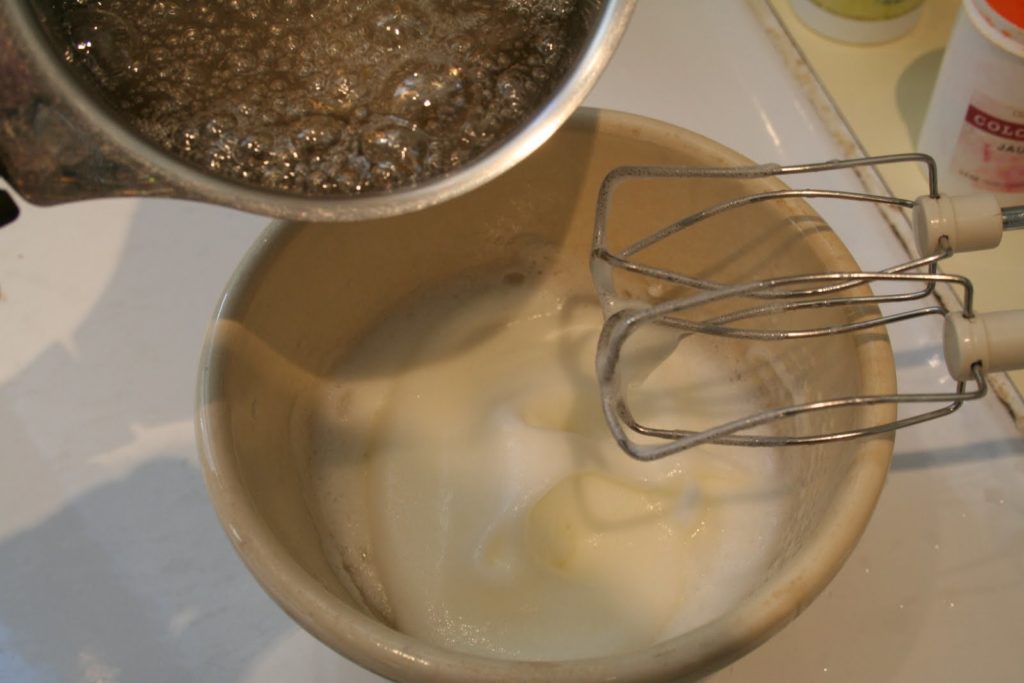 Quand le sucre atteint finalement 117°C, le verser en filet sur les blancs tout en continuant de fouetter au batteur électrique, (ce que je ne fais pas sur la photo car je prenais la photo!)