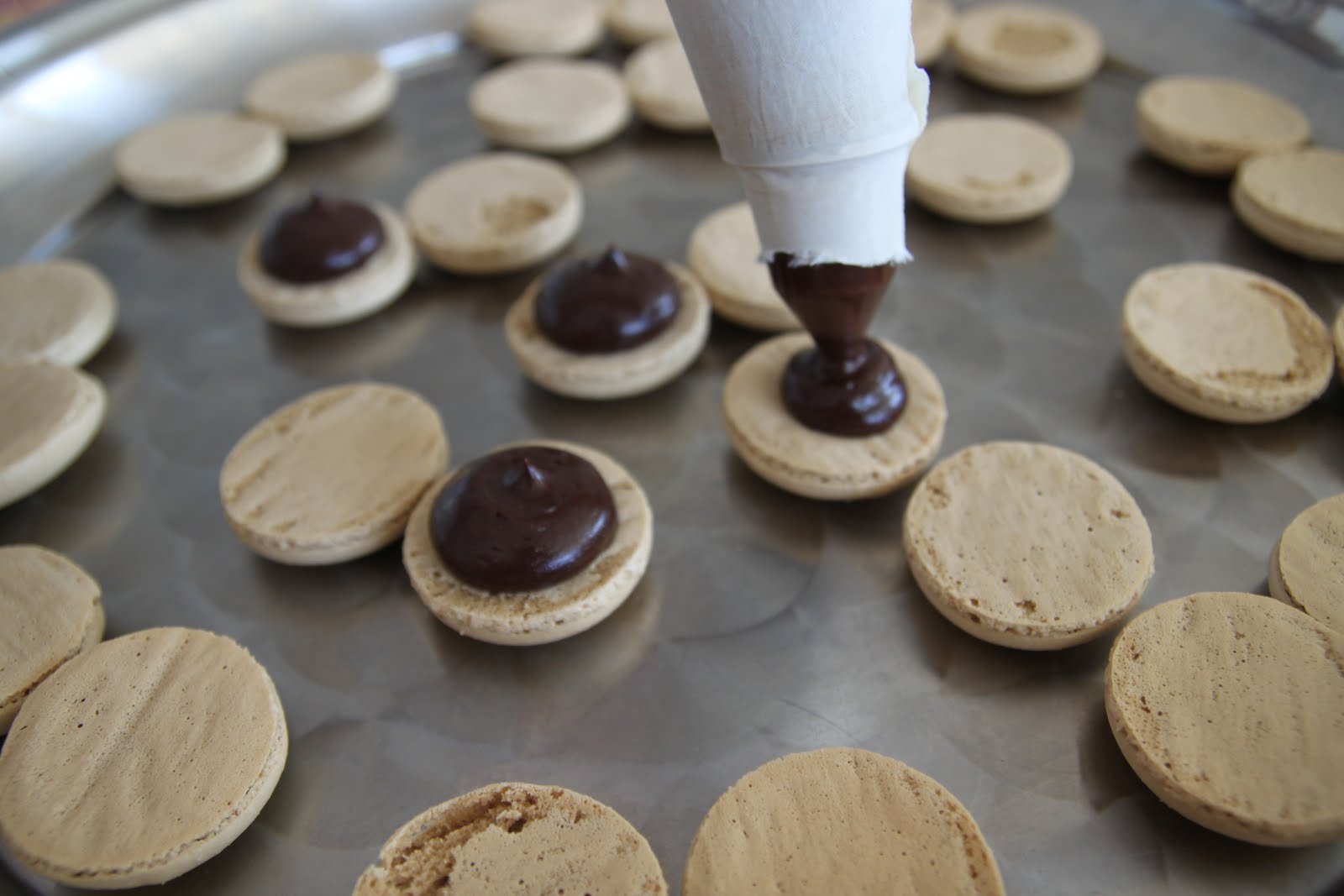 Mettre la ganache dans une poche munie d’une douille et laisser celle-ci se raffermir. Quand la ganache est « modelable », garnir les coques de macarons.