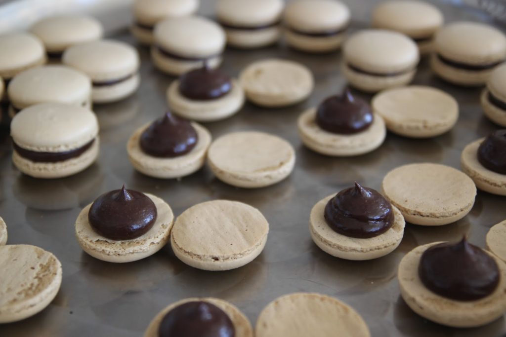 - Mettre la ganache dans une poche munie d’une douille et laisser celle-ci se raffermir. Quand la ganache est « modelable », garnir les coques de macarons.