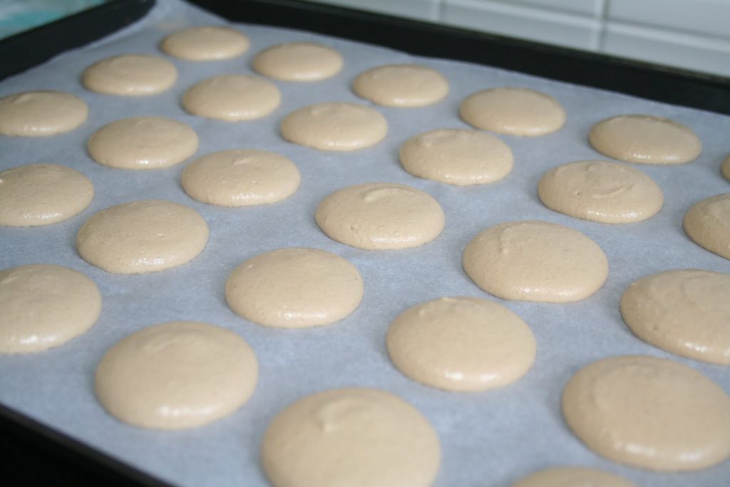 Commencer par réaliser une recette de macarons. Voiricipour la recette en images. À la différence qu’il faut ajouter le café soluble dans les blancs d’oeuf qui vont dans le tant pour tant.
