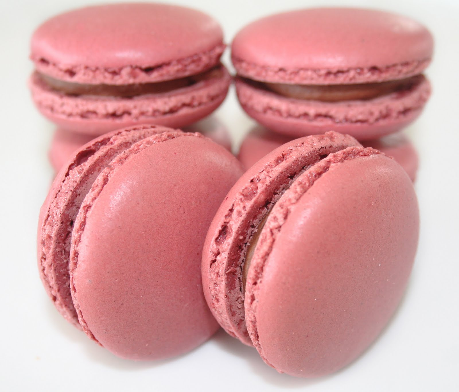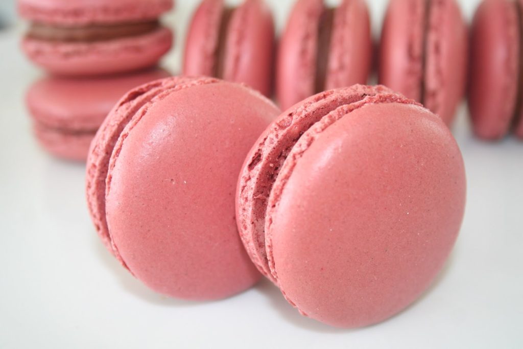 On m’a plusieurs fois demandé la recette des macarons au chocolat (que je donne également ici!) mais je ne trouve vraiment pas cette recette intéressante. Le résultat ressemble trop à un gâteau au chocolat. Alors qu’avec de la framboise, le résultat devient saisissant! La ganache au chocolat avec du coulis de framboises va donner de l’ampleur à ces macarons!