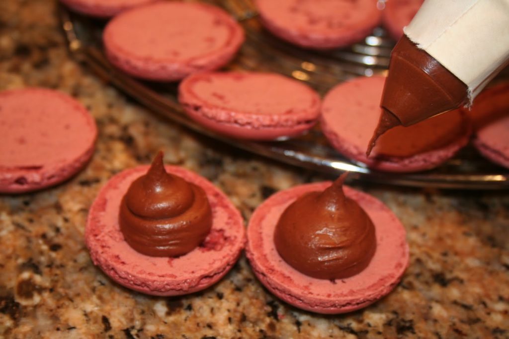 - Mettre la ganache (quand elle trouve une belle apparence) dans une poche à douille et garnir les macarons d’une couche de ganache généreuse.