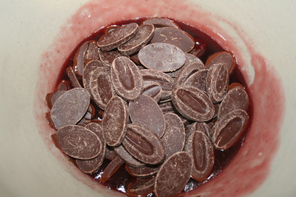 - Ajouter le chocolat (pour ma part, la couverture manjari qui se marie à la perfection avec la framboise!