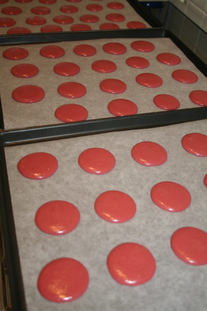 D’abord, rendez vous sur mon explication de la base des macarons dans laquelle on ajoute 15g de cacao non sucré en poudre et un colorant rouge en poudre.