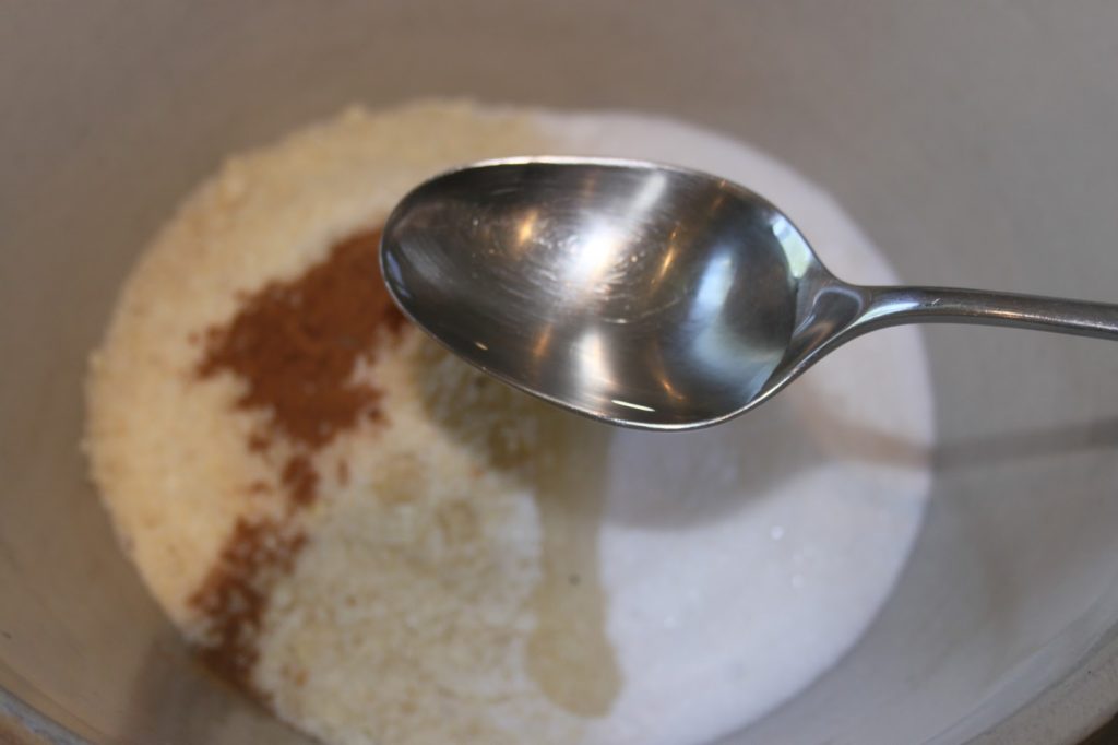 Mettez le sucre, le quart de cuillerée à café de cannelle, la poudre d’amandes et l’eau de fleur d’oranger dans un récipient.