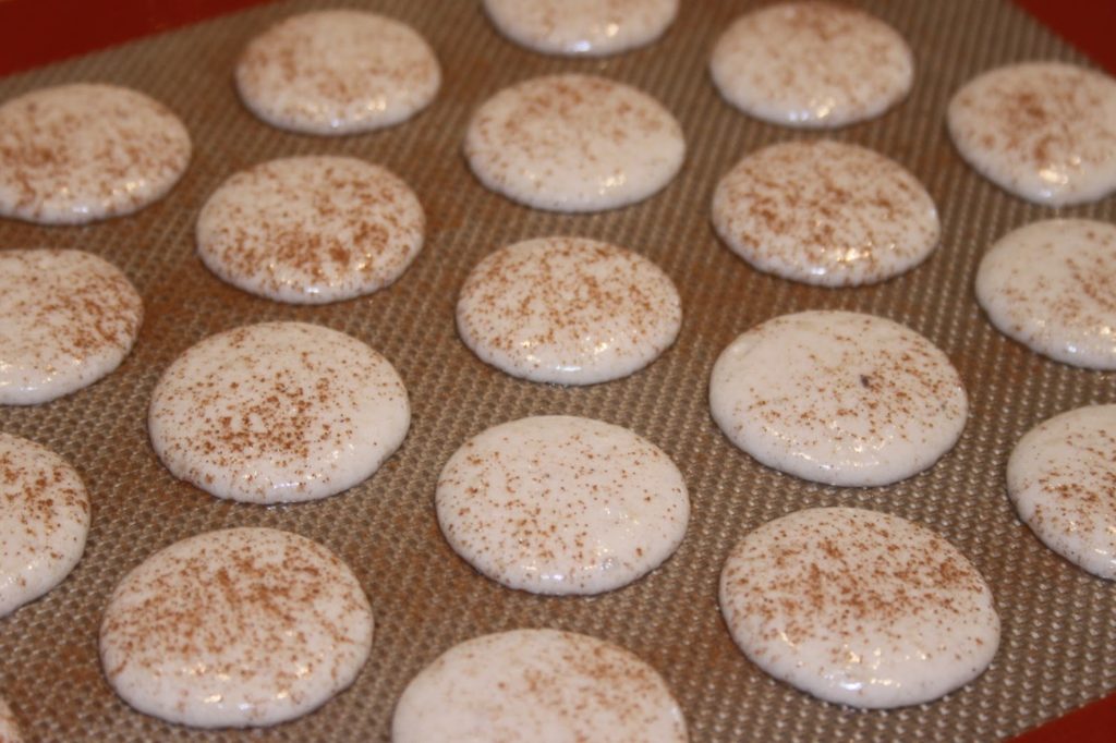 Formez vos macarons avec une poche munie d’une douille de 8mm. Saupoudrez ensuite la moitié des fournées de macarons de cannelle en poudre.