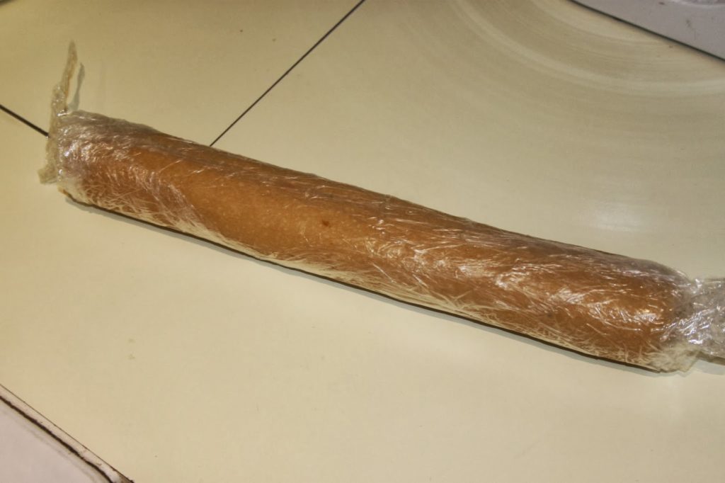 - Mettez la pâte en un boudin de 4 centimètres de diamètre dans du film étirable. Mettez ensuite ce boudin sur une plaque à pâtisserie pendant 1 heure au congélateur. Cela va raffermir la pâte que vous pourrez couper en tronçons.