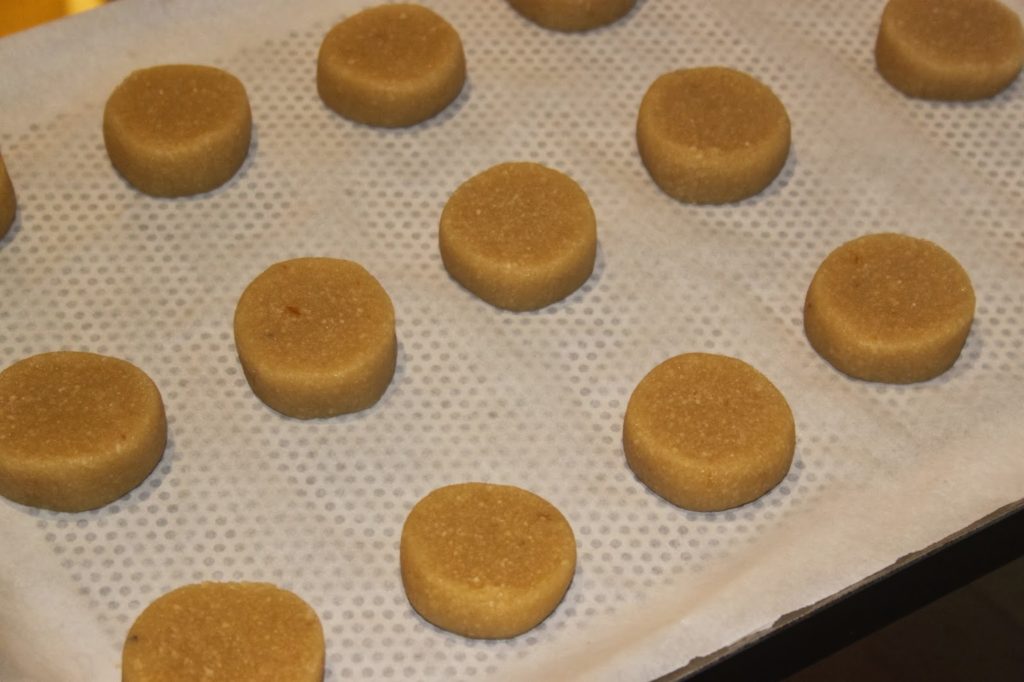 Mettez la pâte en un boudin de 4 centimètres de diamètre dans du film étirable. Mettez ensuite ce boudin sur une plaque à pâtisserie pendant 1 heure au congélateur. Cela va raffermir la pâte que vous pourrez couper en tronçons.