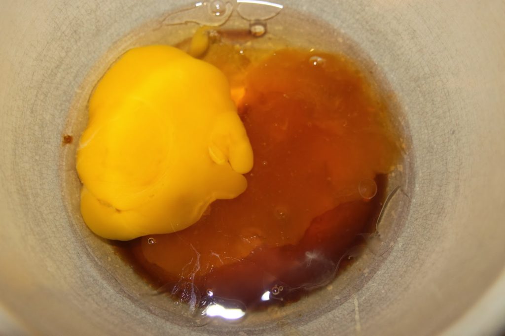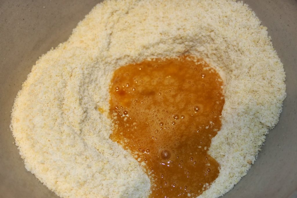 - Dans un bol, mélangez le reste: le miel, le jaune, le blanc, la vanille, l’extrait d’amande amère, la confiture d’abricots.