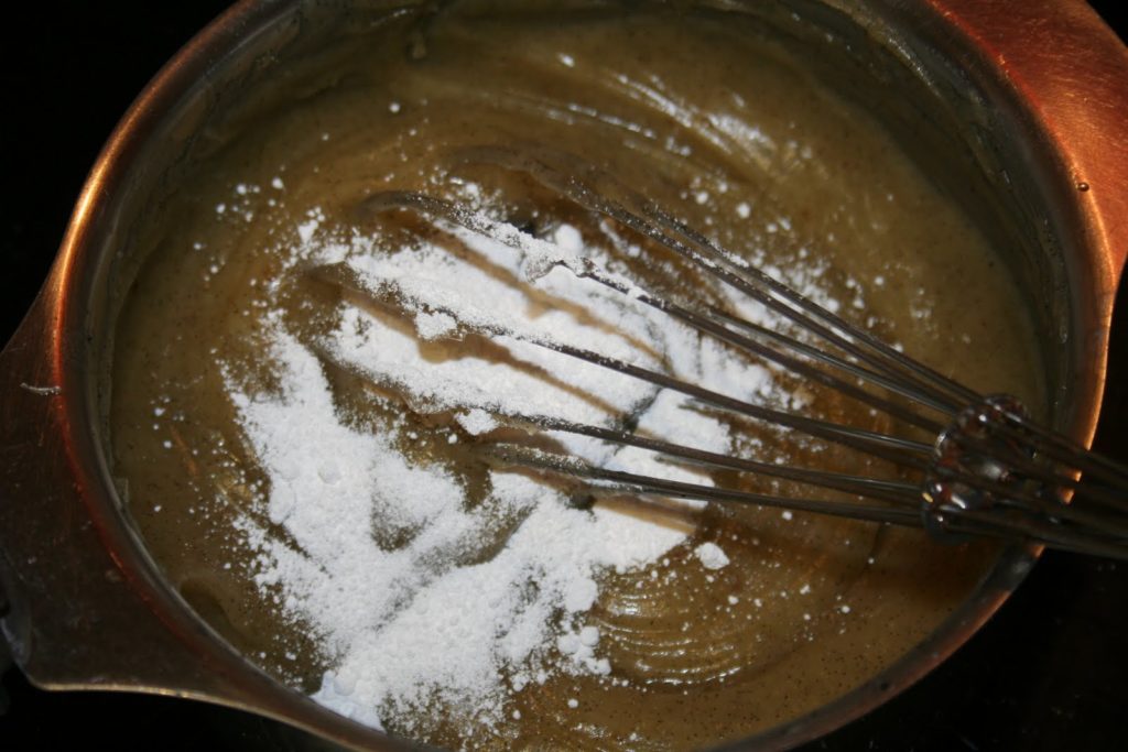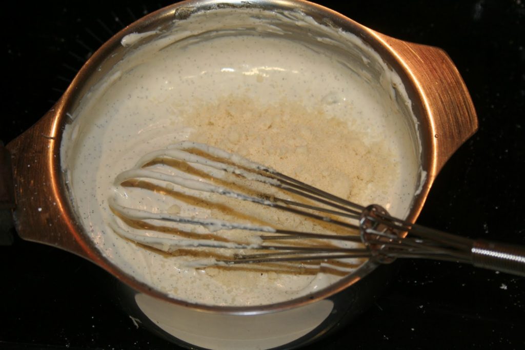 - Contiinuer ensuite avec la garniture vanille. Mettre l’oeuf et 50g (des 125g) dans un bol. Fouetter légérement et ajouter la maïzena.