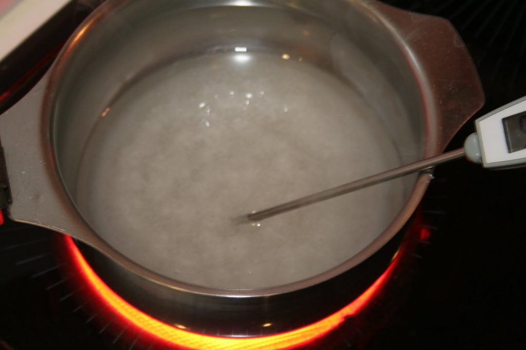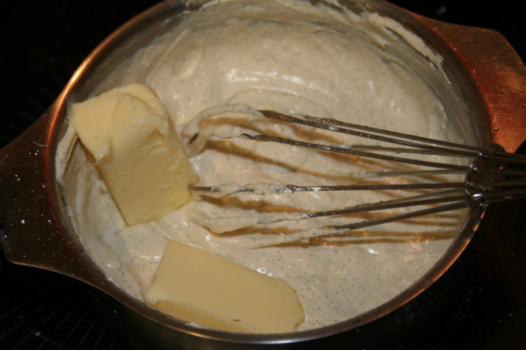 Bien mélanger, puis ajouter l’oxyde de titane (je mets ce colorant pour amplifier le contraste avec les grains de vanilline) hors du feu.