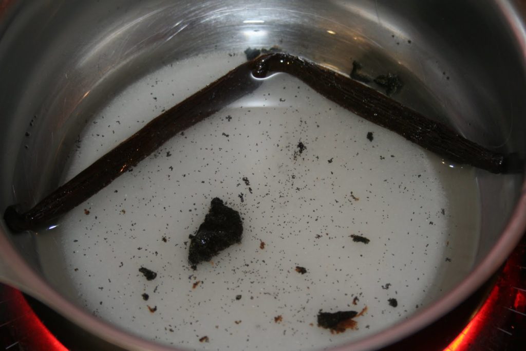 - Mettre les 75g de sucre avec l’eau et la gousse de vanille fendue en deux et grattée dans une casserole. Ajouter également le sucre vanillé et la vanille en poudre. Faire bouillir. Arreter la cuisson et laisser infuser 10 minutes hors du feu.