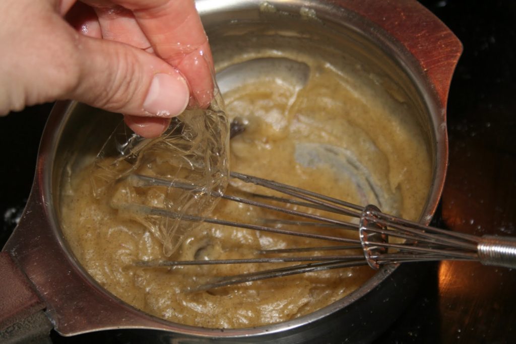- Verser le sirop sur le mélange d’oeuf. Bien mélanger puis remettre le tout dans la casserole. Mettre à cuire doucement en ne cessant jamais de remuer. Laisser bouillir doucement jusqu’à ce que le mélange épaississe. Ajouter à ce moment la gélatine essorée.