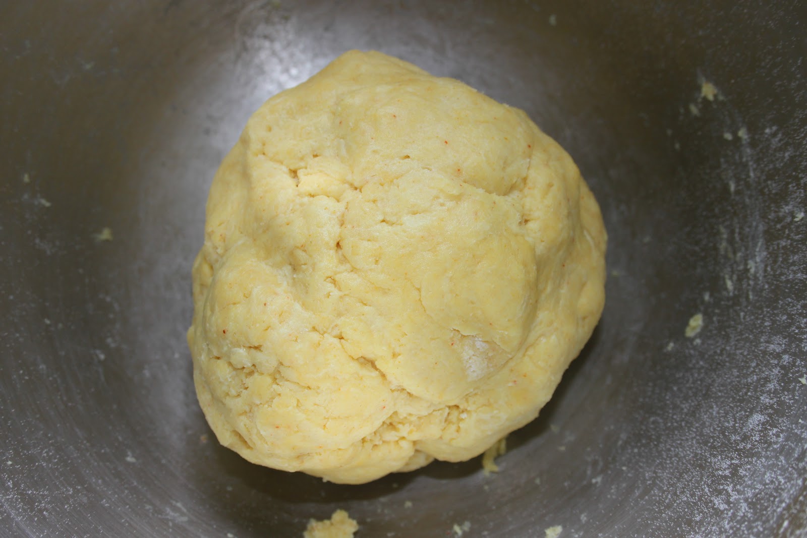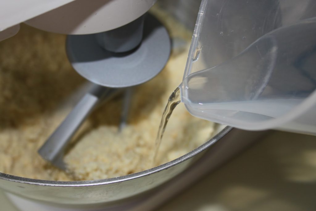 - Mélanger de nouveau puis ajouter l’eau froide. Il faut ajouter l’eau lentement. Quand la pâte se forme, c’est bon!
