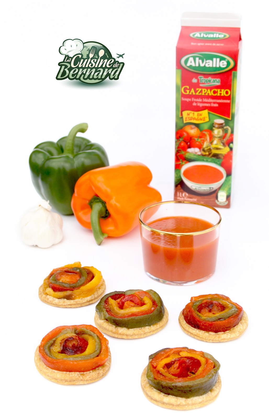 Le partenariat avec Alvalle s’achève ce mois-ci. Je continue avec joie de vous trouver des recettes pour accompagner leurs produits frais pour un été riche en saveurs! Des couleurs ensoleillées: une pâte brisée au curcuma tachetée de piment en poudre, des poivrons jaunes, oranges, verts, rouges, une huile d’olive parfumée et pleine de lumière. Voilà l’assemblage que je vous propose pour accompagner le sublime Gazpacho Alvalle. Ces petites « tatin » composées d’une rosace de poivrons colorés, sur une pâte brisée, presque naturellement feuilletée, accompagneront avec plein de vitalité et de gourmandise, ce grand classique explosif et frais qu’est le Gazpacho Alvalle! Vous verrez à quel point réaliser soi-même ses propres poivrons grillés est facile et rapide, mais surtout vraiment délicieux!