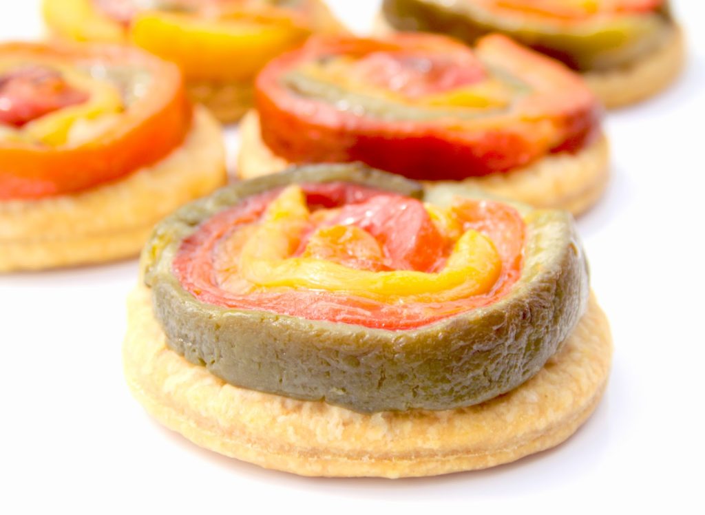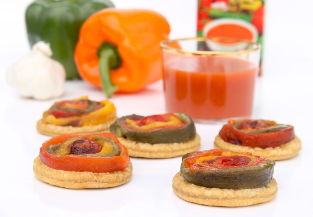 Des couleurs ensoleillées: une pâte brisée au curcuma tachetée de piment en poudre, des poivrons jaunes, oranges, verts, rouges, une huile d’olive parfumée et pleine de lumière. Voilà l’assemblage que je vous propose pour accompagner le sublime Gazpacho Alvalle. Ces petites « tatin » composées d’une rosace de poivrons colorés, sur une pâte brisée, presque naturellement feuilletée, accompagneront avec plein de vitalité et de gourmandise, ce grand classique explosif et frais qu’est le Gazpacho Alvalle! Vous verrez à quel point réaliser soi-même ses propres poivrons grillés est facile et rapide, mais surtout vraiment délicieux!