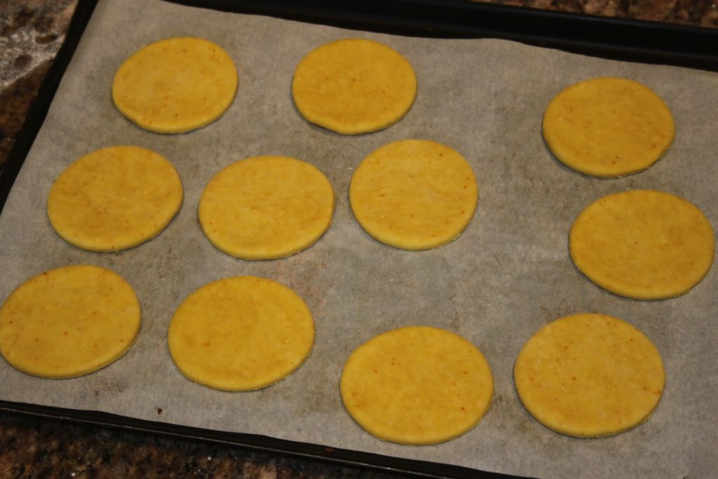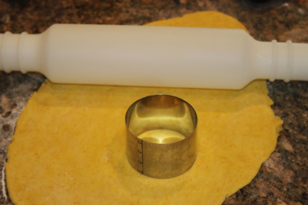 - Mettre la pâte sous film étirable pendant une heure au frais. Au bout de ce temps, étaler la pâte sur un plan de travail fariné ou sur un papier de cuisson. Couper des empreintes de pâte de 8 à 10cm de diamètre. On choisit la taille que l’on veut!!