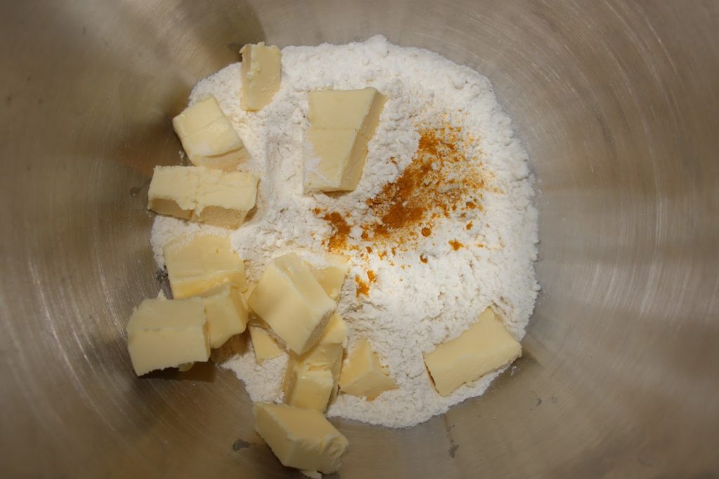 - Le lendemain, préparer la pâte brisée en mettant la farine, le curcuma, le piment fort et le beurre froid coupé en cubes dans un bol.