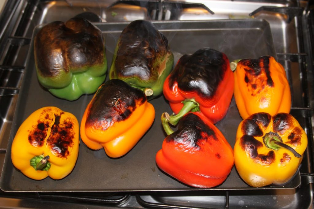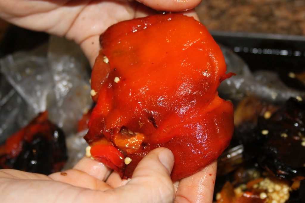 - Quand les poivrons sont refroidis, ils sont tout mous. Les éplucher à la main en retirant la peau brûlée et les graines à l’intérieur. C’est beaucoup moins fastidieux que cela en a l’air!