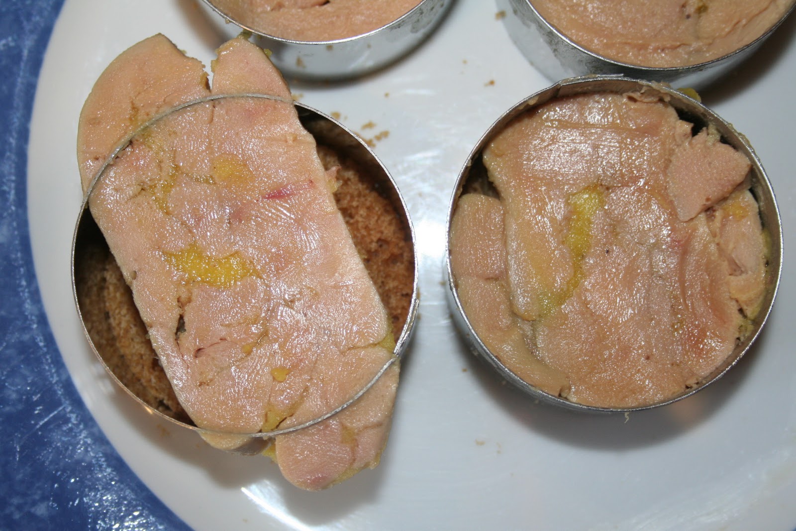 Couper 4 bonnes tranches de foie gras mi-cuit. Enfoncer la tranche dans le cercle…