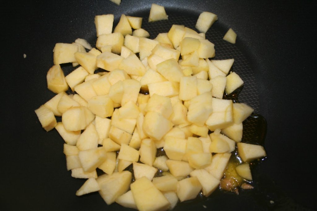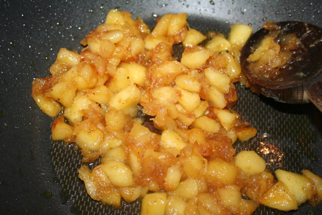 Puis laisser cuire les pommes jusqu’à ce qu’une partie d’entre elles soit fondue et caramélisée.