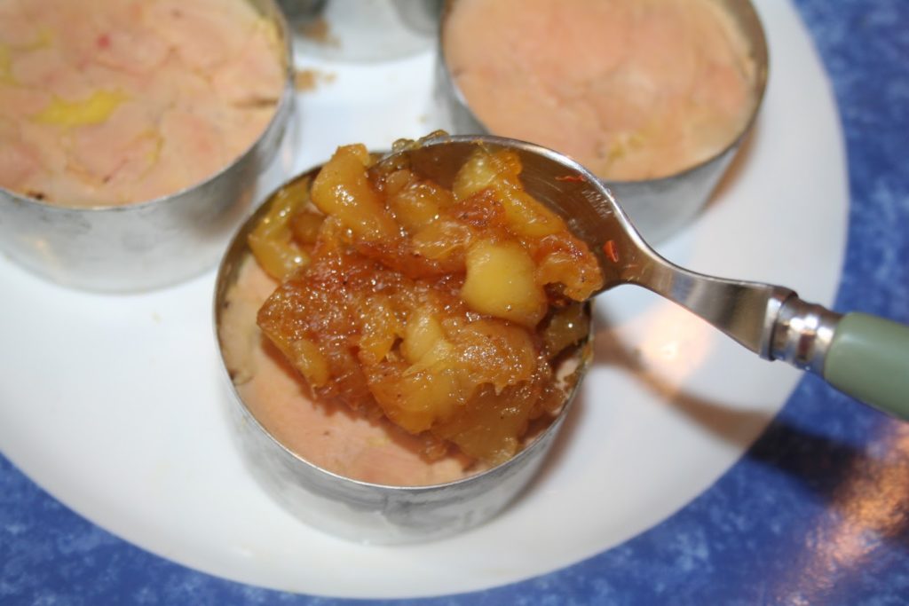 -4 tranches de pain d’épices -4 tranches de foie gras (conserver le gras jaune qui se trouve au dessus) -3 ou 4 pommes -2 ou 3 bonnes pincées de mélange de 4 épices -1/2 verre à digestif de cognac ou de calvados -10g de sucre -sel, poivre