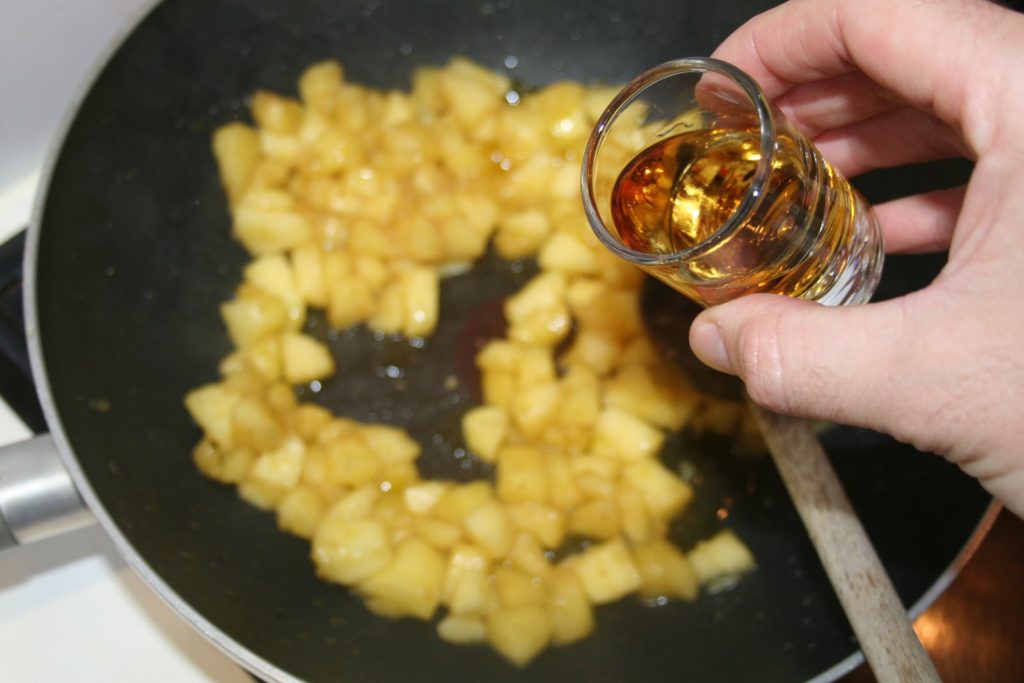 Quand les pommes commencent à être tendres, ajouter le cognac.