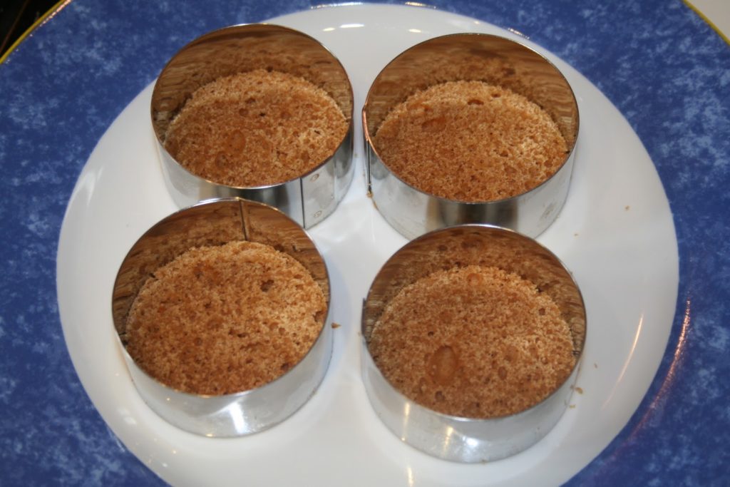 Couper des tranches pas trop épaisses de pain d’épices. Avec un cercle de 6cm, tailler directement dans la tranche comme un emporte pièce.