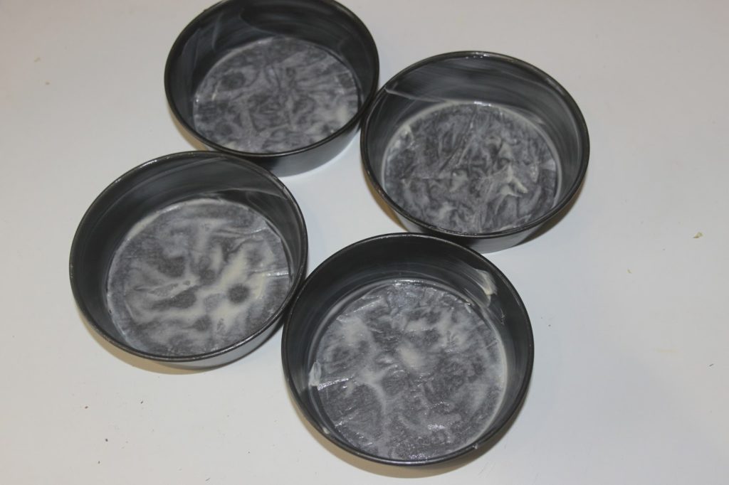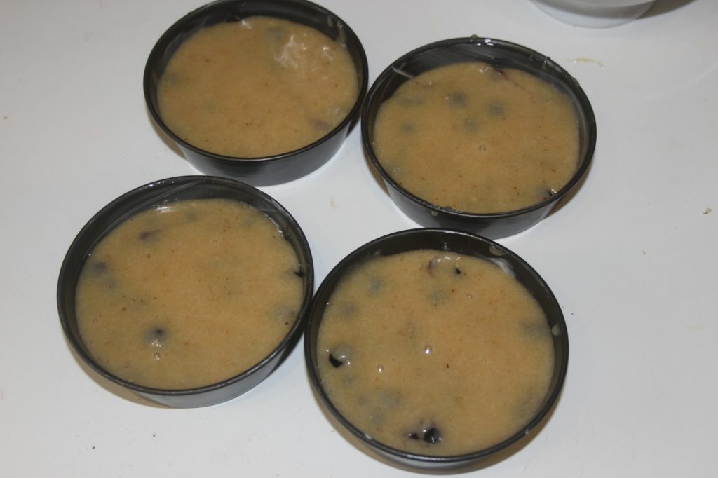 Beurrer et garnir le fond de papier sulfurisé de 4 petits moules de 9 centimètres ou un moule unique de 18cm.