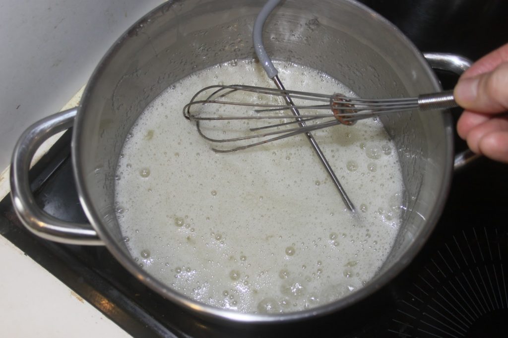 Mélanger en fouettant en portant le tout à 45°C. Cela prend 2 ou 3 minutes en tout.