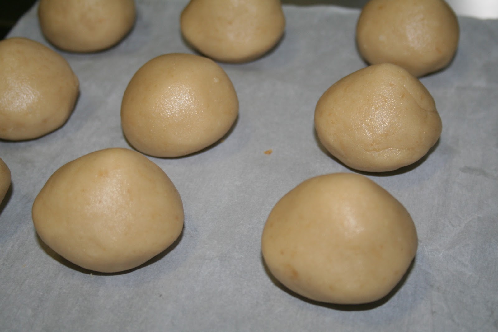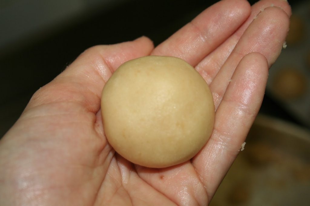 Puis former toujours entres les deux mains, des sortes de « toupies » comme présentées ci-dessous. J’ai eu un peu de mal au départ à obtenir cette forme caractéristique mais j’ai finalement réussi en recroquevillant les deux mains, c’est à dire en roulant les boules rapidement entre les deux paumes formées en creux (à l’inverse des mains à plat).