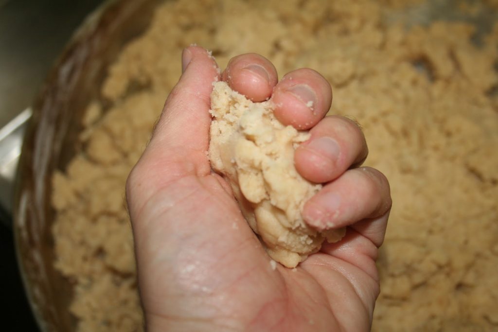 Suivant la farine et les amandes utilisées, il faudra ajouter plus ou moins d’huile, il faut arrêter d’en mettre dès que la pâte peut se mettre en tas.