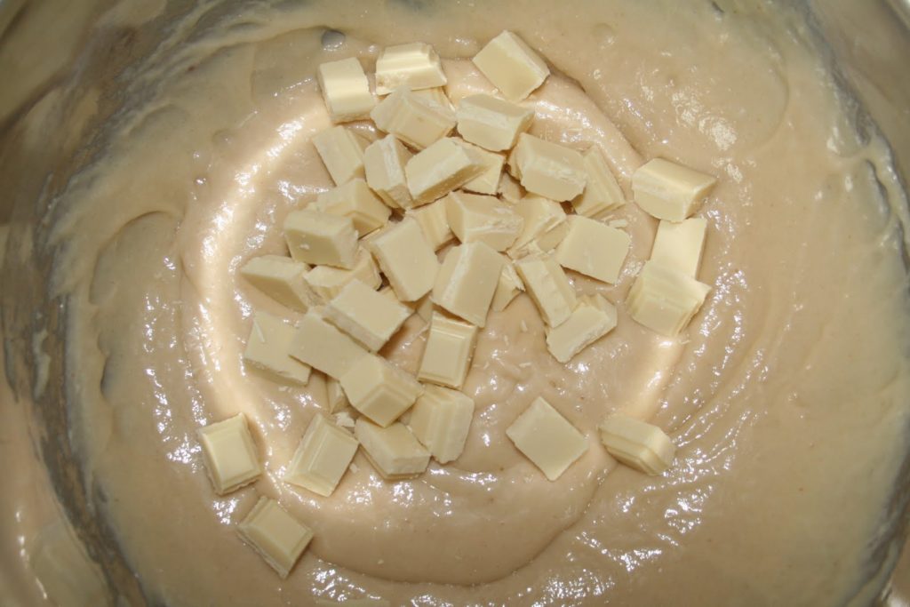 - Couper le chocolat blanc en morceaux. Je coupe les carrés d’une tablette (nestlé) juste en deux… Ajouter la levure et bien mélanger pour répartir celle-ci dans la pâte.