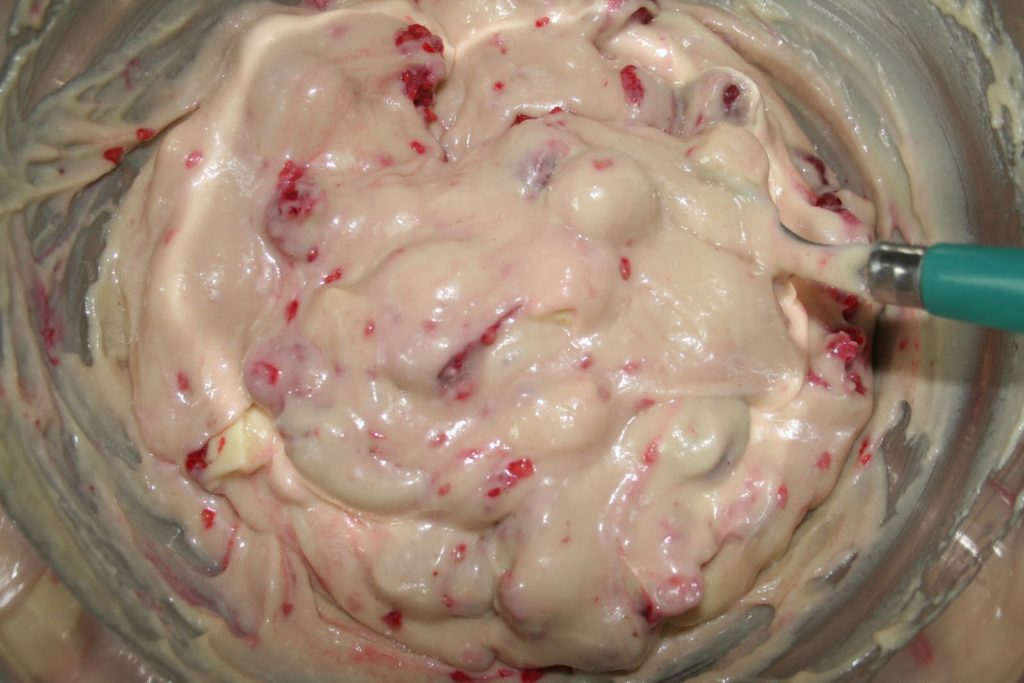 Mélanger en faisant attention de ne pas écraser toutes les framboises, jste un peu pour rosir la pâte!