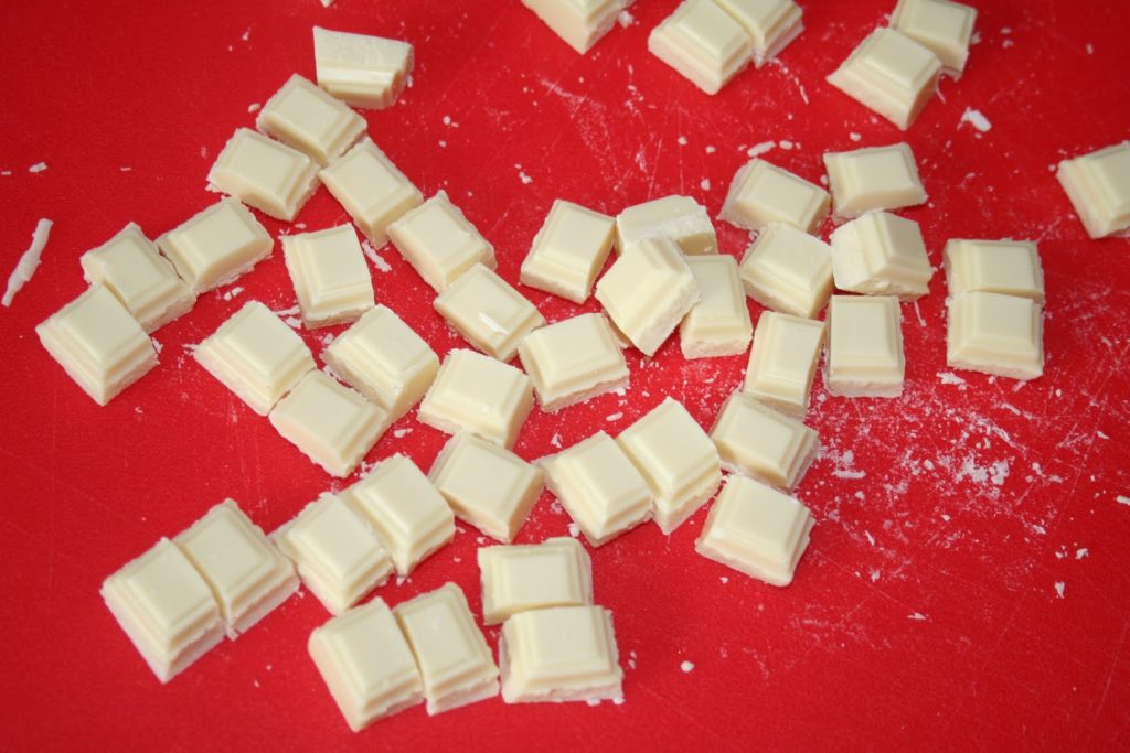 Couper le chocolat blanc en morceaux. Je coupe les carrés d’une tablette (nestlé) juste en deux…
