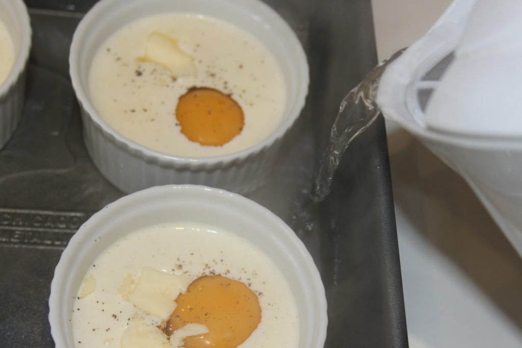 - Ajouter de l’eau bouillante dans le plat jusqu’au trois quarts de la hauteur des ramequins. Ajouter une petite noix de beurre salé à côté du jaune, poivrer légèrement.
