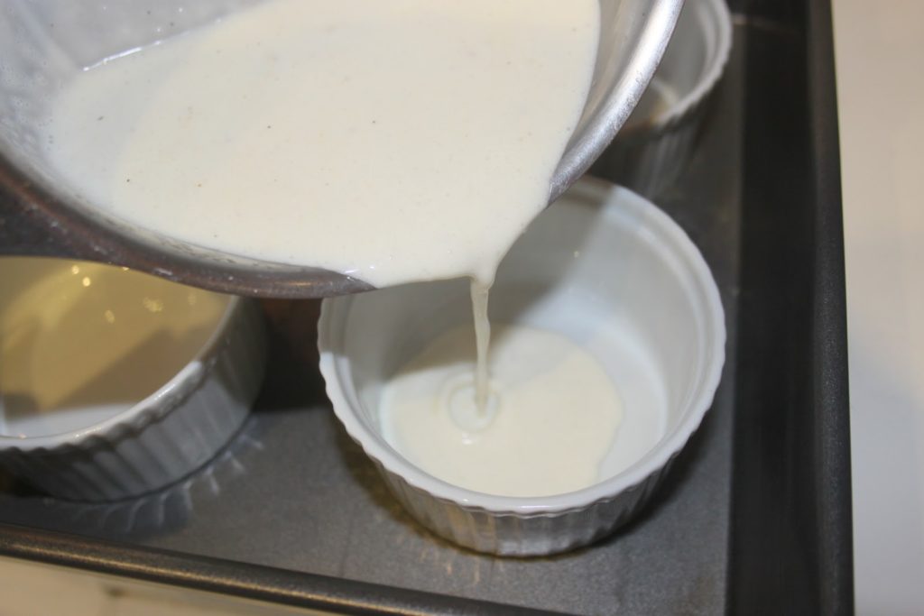 Au bout de ce temps, la crème s’est un peu épaissie. La verser dans quatre ramequins individuels en portions égales.