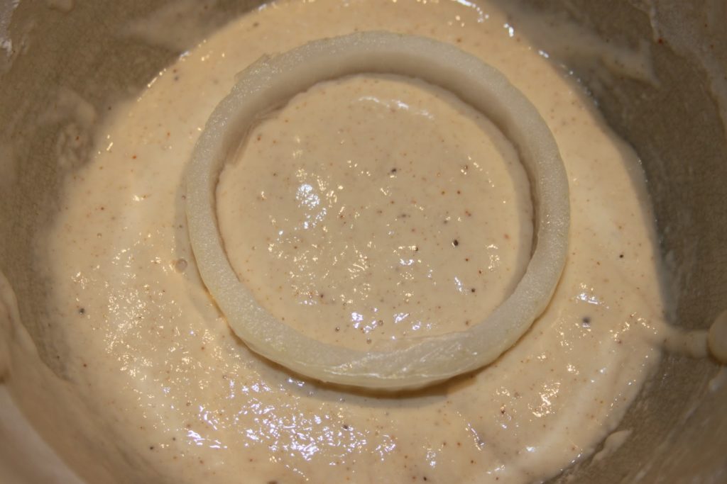 - Tremper les anneaux d’oignons avec une fourchette. Il faut complètement plonger l’oignon dans la pâte.