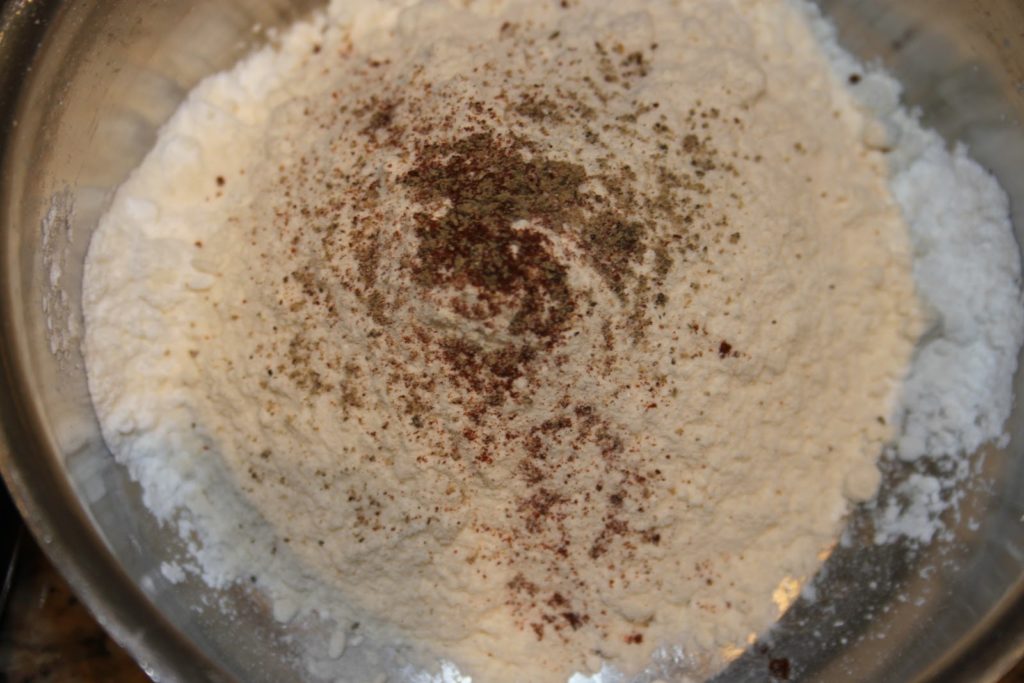 - Préparer la pâte: mettre la maïzena, la farine, le sel, poivre, ajouter un peu de paprika et de piment doux.