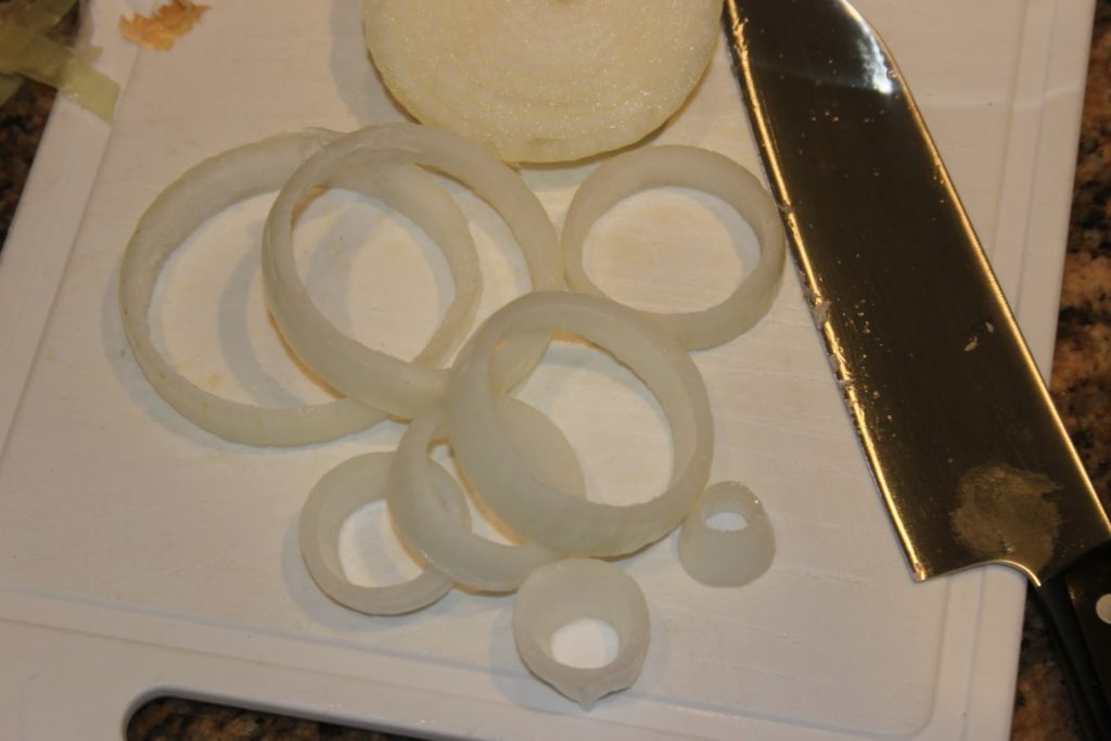 - Couper les oignons en tranches assez larges (moins d’un centimètre quand même!) puis séparer les différentes couches.