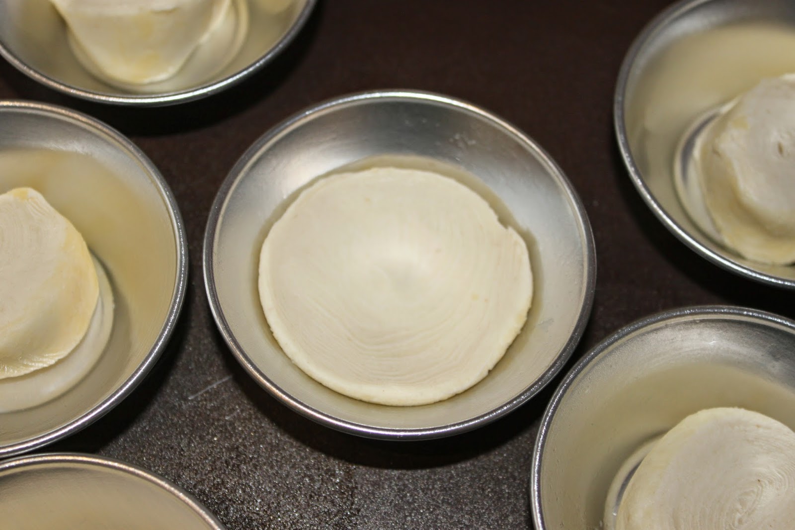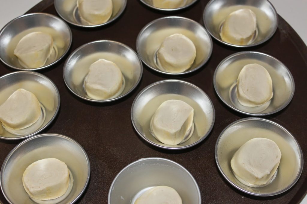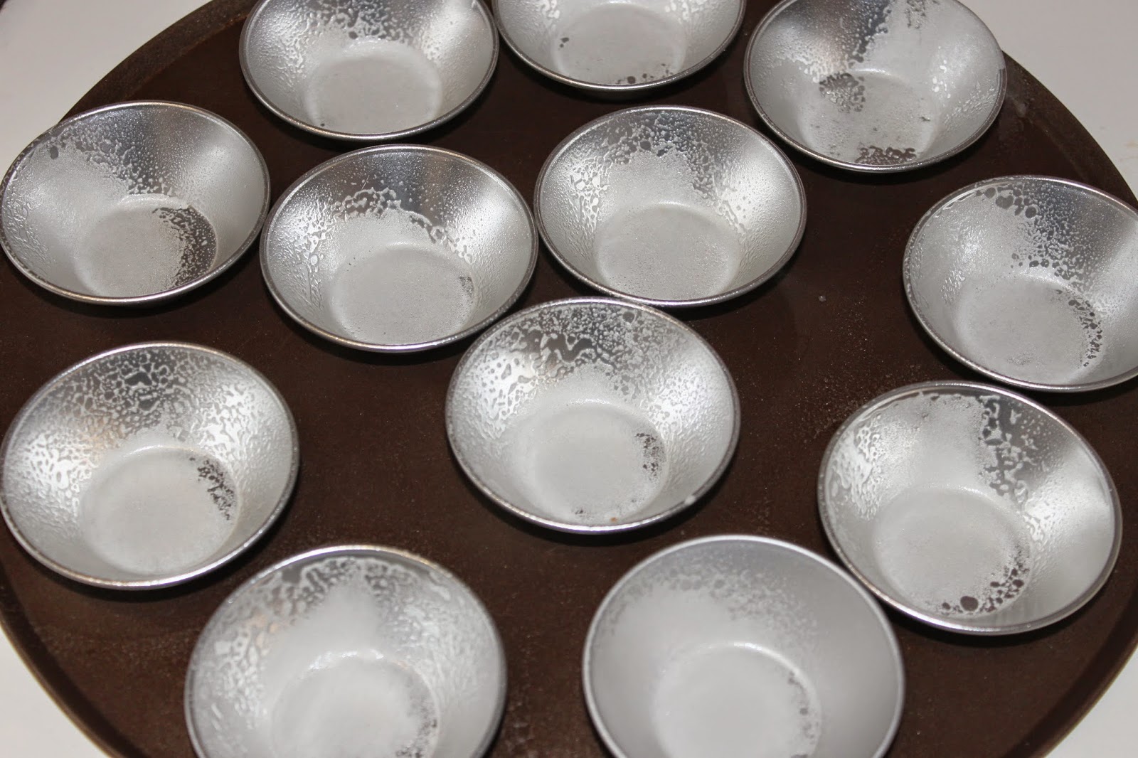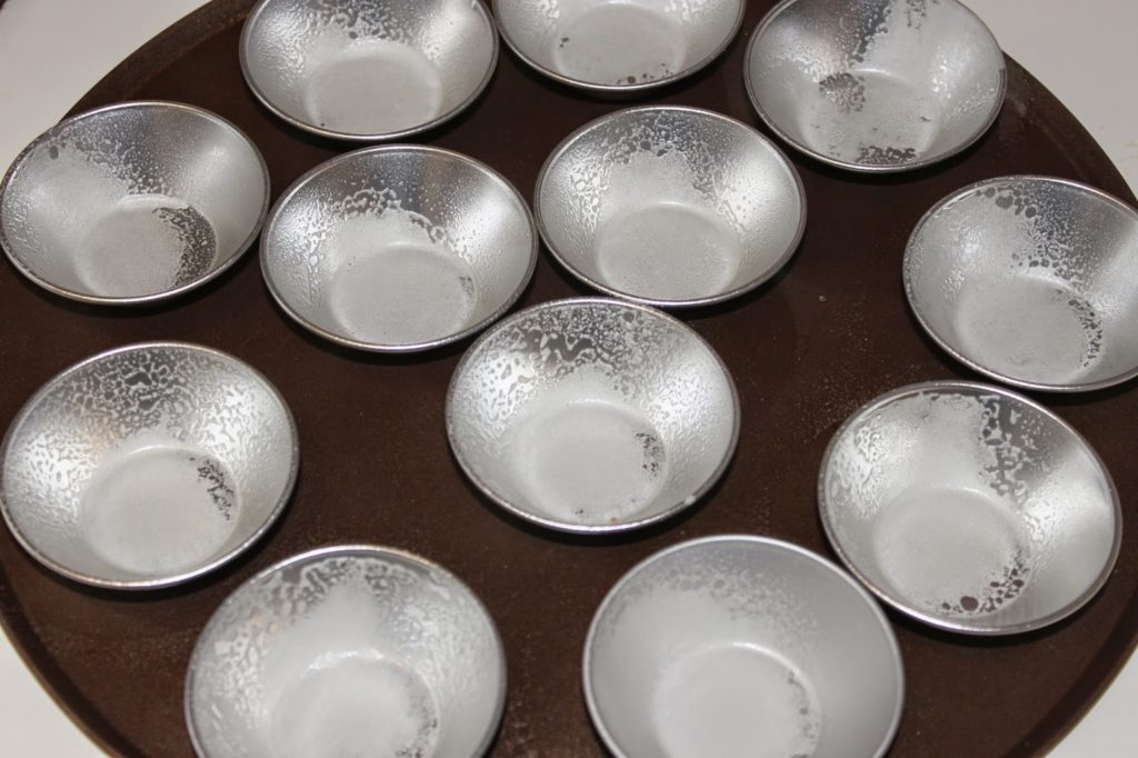 - Voici les fameux moules à pastéis. Vaporisez un peu de bombe de démoulage sur chaque moule. Je parle de cette bombe dans la recette des canelés ICI !