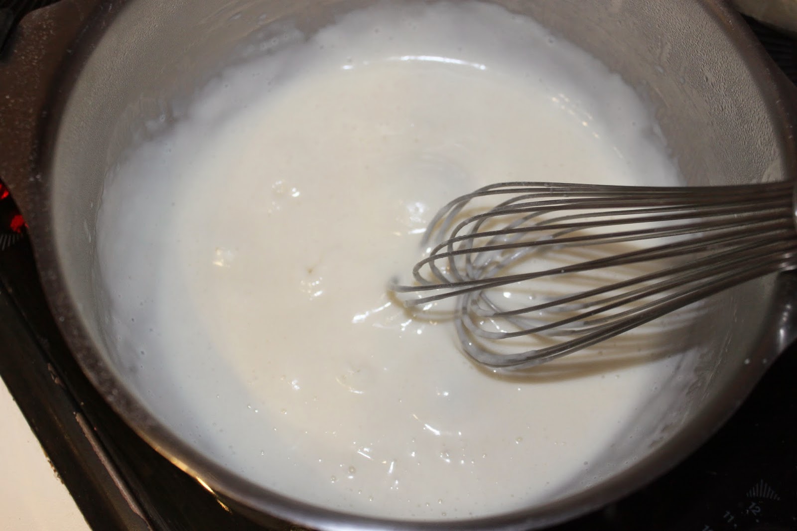 Portez à ébullition tout en fouettant sur feu doux. La crème épaissit. Une fois que cela bout, c’est prêt !