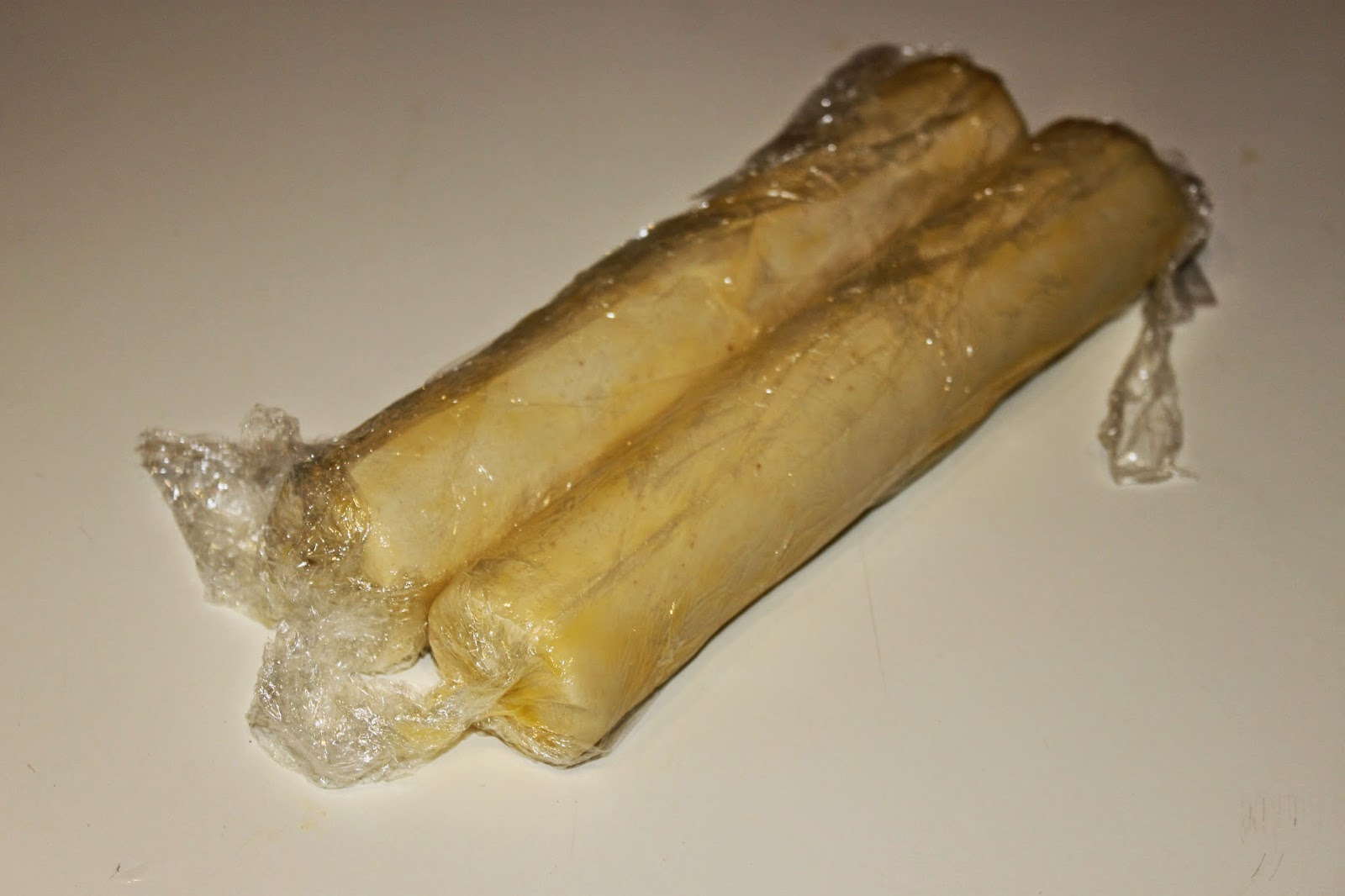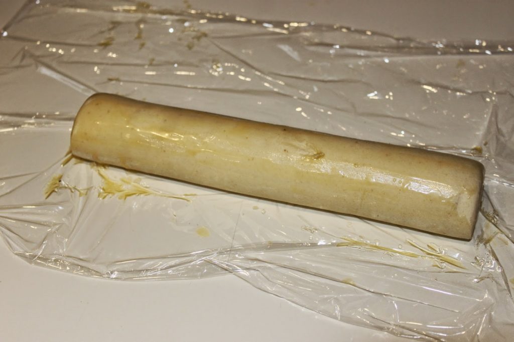 - Coupez le boudin obtenu en deux (car le boudin est trop grand) puis placez chaque moitié sur un film étirable. Badigeonnez toute la surface (en dessous aussi) et les côtés avec de la matière grasse de cuisson fondue (au micro onde dans un bol, mais protégez votre four car la matière grasse a tendance à exploser ! Je mets un film étirable sur mon bol et tout va bien ! ).