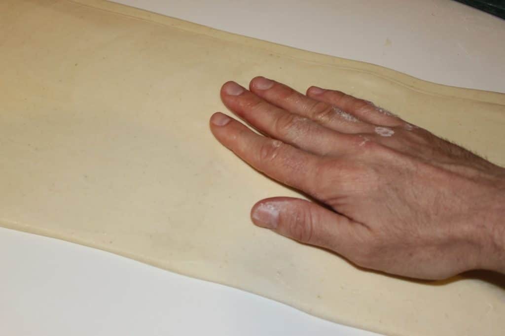 - Repliez de nouveau en trois pour un second tour simple. Tournez de 90° puis étalez la pâte en un long rectangle de 3mm d’épaisseur. Essayez cette fois d’étaler la pâte aussi dans sa largeur.