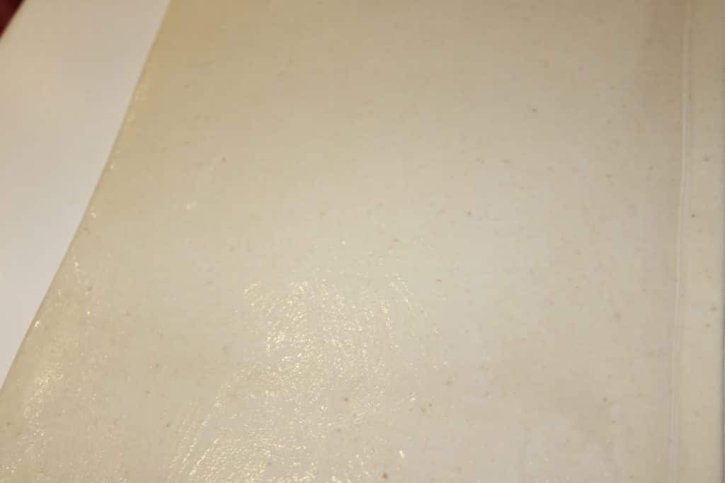 - Assurez-vous bien que toute la surface soit un peu mouillée. Cela va nous permettre d’enrouler la pâte sur elle-même.