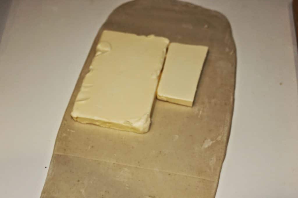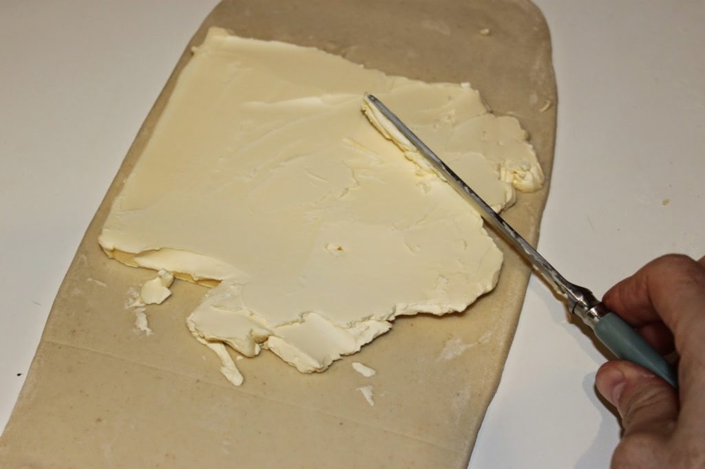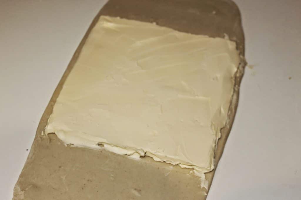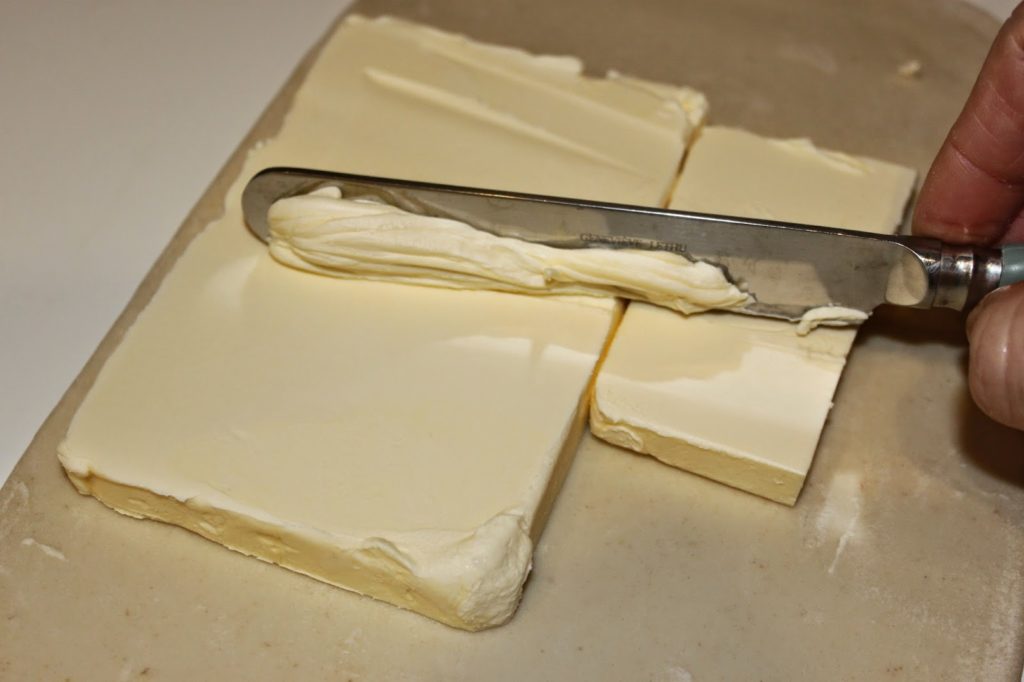 - Prenez la matière grasse de cuisson (ma fameuse Astra) et placez-la sur le carré. Il faut qu’elle soit à température ambiante.