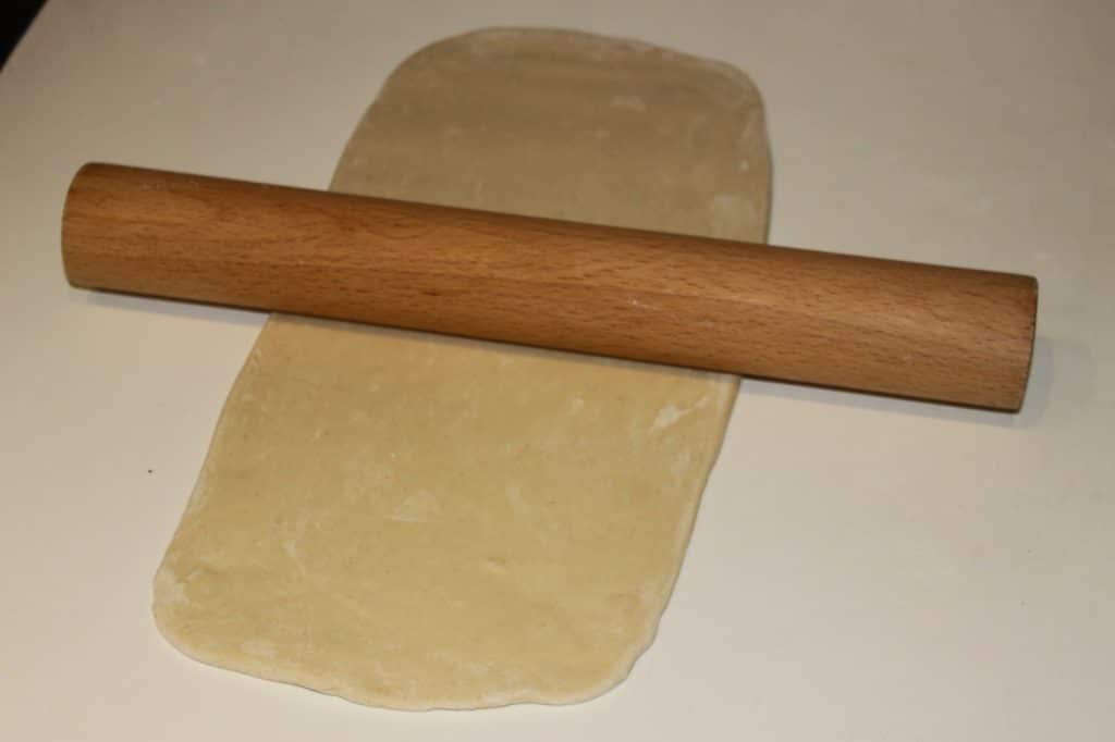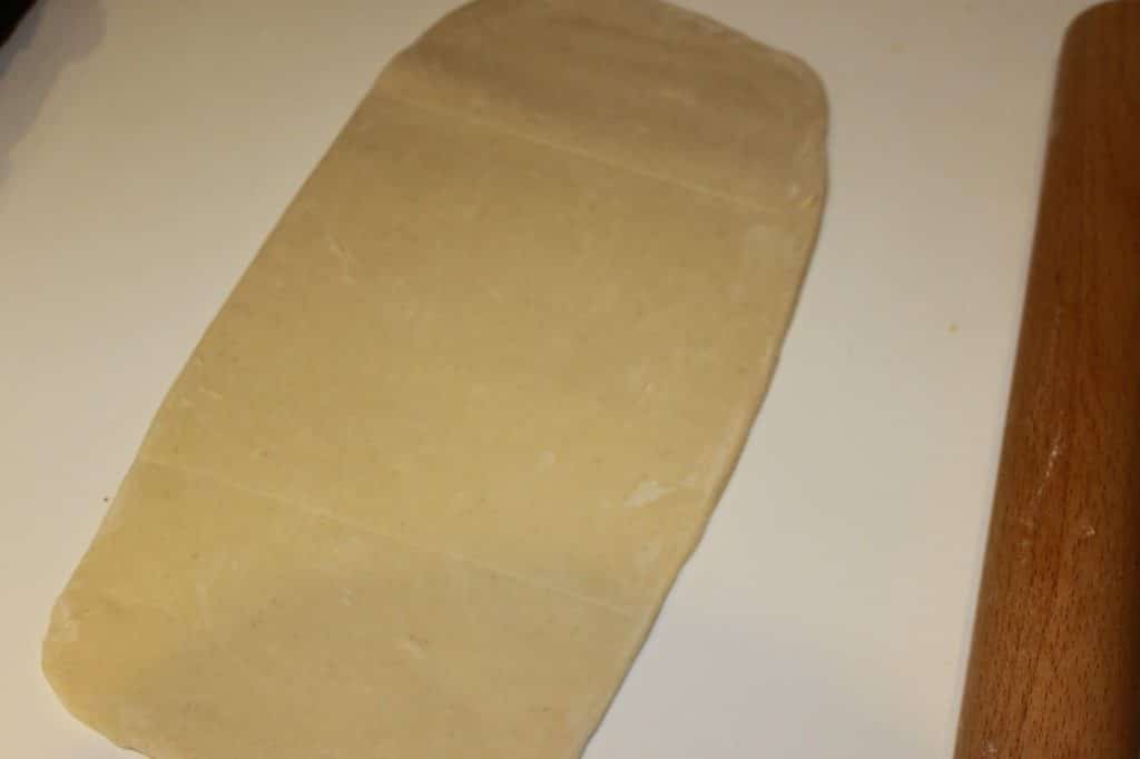 - Étalez la pâte en un rectangle deux fois plus long que large sur une épaisseur de 5mm. Tirez éventuellement les quatre coins avec vos mains pour donner la forme la plus rectangulaire possible.