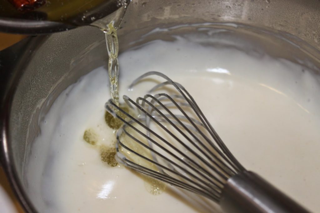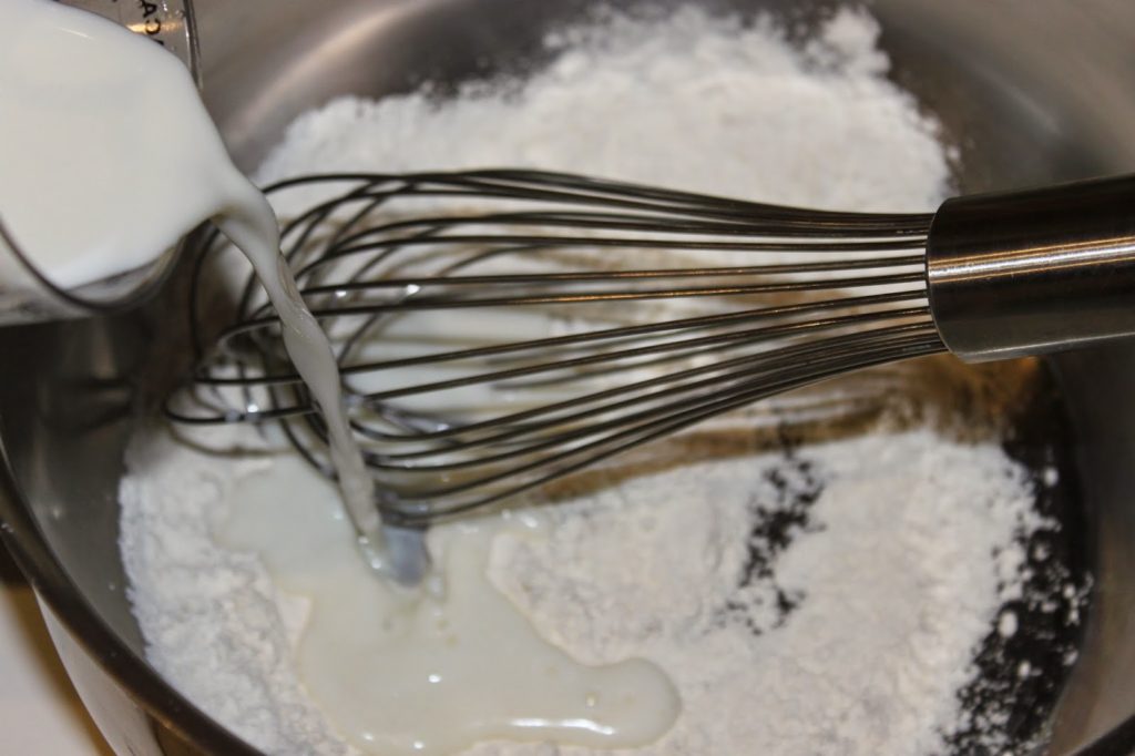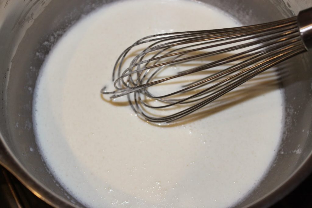 - Préparez une sorte de béchamel en mélangeant la farine avec le lait. Versez-en d’abord un peu tout en fouettant puis mettez le reste une fois que vous êtes sûrs qu’il n’y a pas de grumeaux.